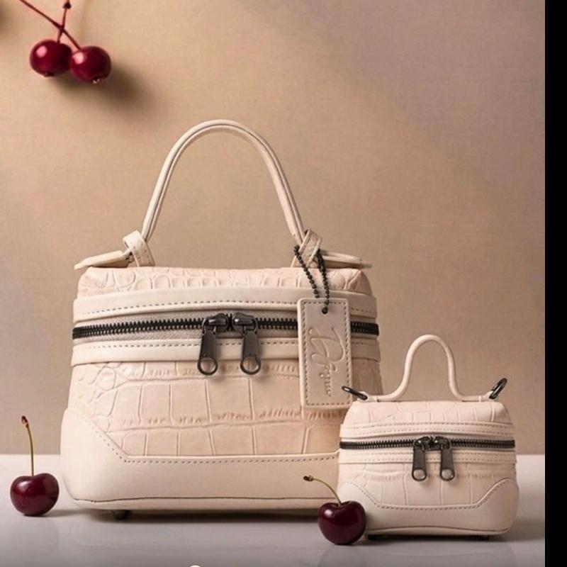 SAKIRA MOM PRODUCT KNOWLEDGE; - ⁠Material: Croco mix Jenna leather Croco (memiliki tekstur kulit buaya, halus, dengan finishing glossy) Jenna leather (bertekstur halus, tebal, dengan finishing matte) - Roomy compartment - ⁠Lining satin - Dua zipper premium - ⁠Gantungan logo djisoo - Black hardware - Handle pendek 28cm - Strap panjang 106cm - Strap panjang adjustable - Terdapat kaki tas bagian bawah - Berat: -+170gram - ⁠Available dalam 5 warna - Include tag and dustbag DETAIL SIZE; - Panjang: 23cm - Lebar: 8cm - ⁠Tinggi: 15cm #sakiramom #momsdetail